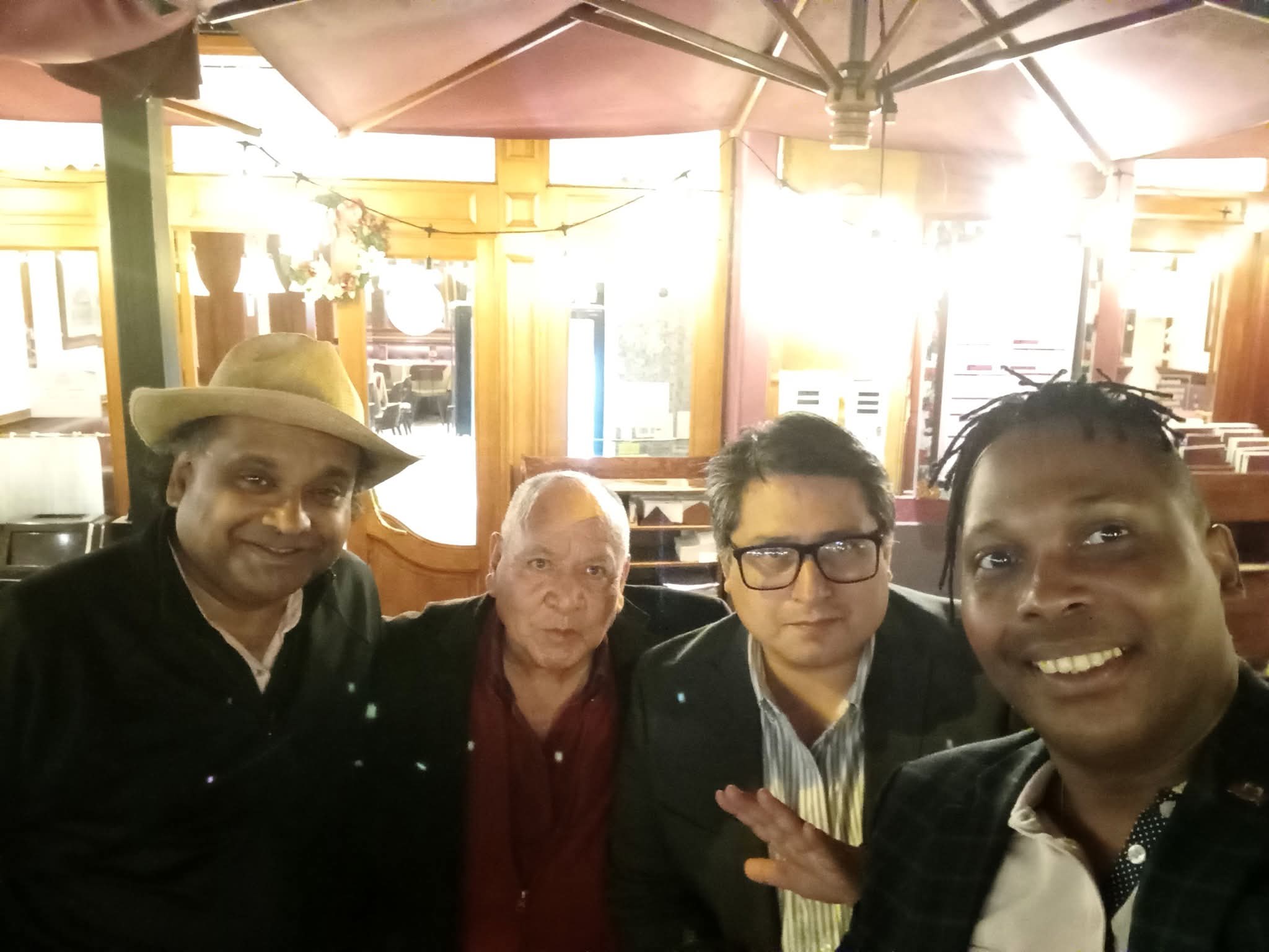 Volviendo a nuestro encuentro de esta tarde en el café, debo mencionar que Indran, además de su vivo interés por los últimos avances de la poesía latinoamericana contemporánea, regaló al poeta Aramayo un ejemplar de su nuevo libro «Isla Itinerante»; esta nueva obra también es considerada por algunos críticos como su mejor obra hasta la fecha. De igual manera, nos confió que estaba preocupado por el tamaño de su estómago —podríamos decir, en el argot mexicano, que tiene un poco de panza—, lo cual no es realmente un secreto, ya que a menudo habla de ello, incluso durante sus recitales, con cierta autoironía. Pero lo más gracioso es que, a pesar de su preocupación, tomó dos cafés acompañados de una deliciosa crepa, lo que nos hizo reír a todos, «discretamente», por supuesto. Conozco muy bien al poeta; es mi hermano mayor en el mundo literario. Nuestra amistad se remonta a cuando él era diplomático en Haití, hace más de diez años, donde forjó estrechos vínculos con todos los actores de la escena cultural haitiana. Me confió, por ejemplo, así como él representa un mentor para mí, el poeta y dramaturgo haitiano recientemente fallecido Frankétienne también fue su mentor. Esto no me sorprende en absoluto, ya que se reunían a menudo para intercambiar poesía durante los tres años que pasó en Puerto-Príncipe.